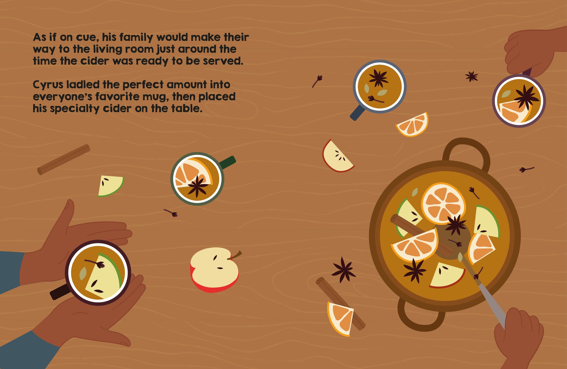 Cyrus and his family love using the fruits that grow in their yard for cooking. While Cyrus's mother whips together delicious apple pies and his father lovingly squeezes fresh orange juice for breakfast daily, Cyrus has a secret recipe for an amazing batch of apple cider that warms both his family's home and their hearts.