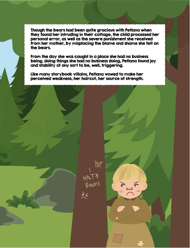 Based on a true, still unfolding tale, this pre-sequel chronicles the villain origin story of Goldilocks, whose real name is Petlana Manwitch. After a traumatic childhood experience that took place just after she was discovered trespassing in the three bears’ home, Petlana grows into an adult with a penchant for bad behavior and an aversion to accountability and joy. While working as a luggage saleswoman in Rome, Italy, Petlana unexpectedly finds herself confronting others as well as her own issues, when she drops one load of trash too many on the doorsteps of her neighbors, the Burchellis, and gets a wake-up call of a lifetime. Coming Winter 2023